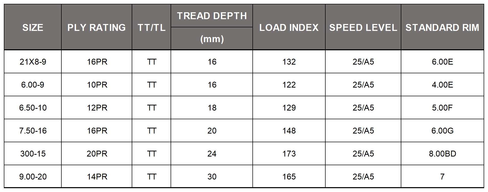 7.50-16 16PR TT 20 148 25/A5 805 215 6.00G 3225